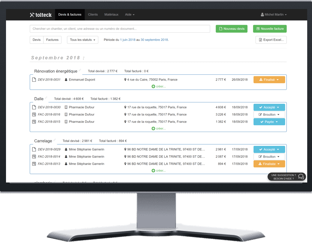 Très bonne expérience avec tolteck assez complet simple à utiliser une très bonne présentation des devis et facture